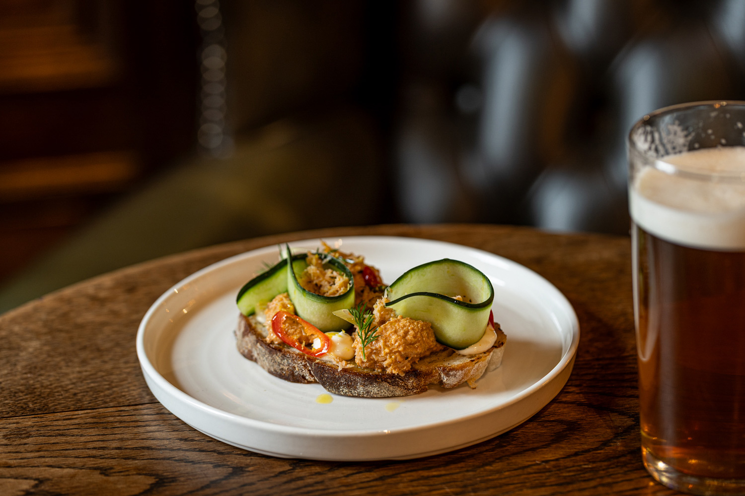Devon crab crostini, chilli, cucumber 505 kcals