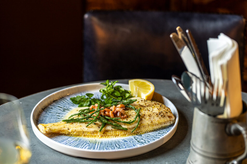 Whole grilled Cornish sole, brown shrimp, samphire, crushed new potatoes | 28 599 kcals